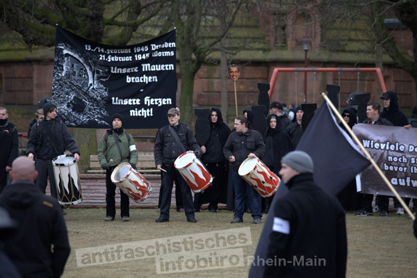 140 Neonazis aus Rheinland-Pfalz, Hessen und Baden-Württemberg reisten am 18. Februar 2012 zum vom Aktionsbüro Rhein-Neckar organisierten „Trauermarsch für die Opfer des alliierten Bombenterrors vom 13. Februar 1945 in Dresden und 21. Februar 1945 in Worms“ an. Sie kamen unter anderem aus dem Raum Ludwigshafen, Zweibrücken, dem Donnersbergkreis, Ried, Offenbach, Sinsheim und der Region Alzey-Worms.
