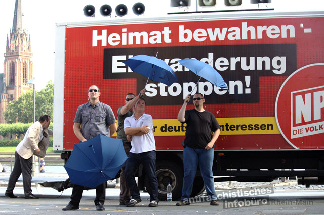 Ob Jörg Krebs, der Vorsitzende der NPD Frankfurt und Stadtratsmitglied, sich nicht zum Kundgebungsort traute oder er sich die Blamage nicht antun wollte, bleibt ungewiss. Wie zuvor sprachen Ronny Zasowk und Holger Apfel. Auch in Frankfurt gingen die Reden im Lärm der Protestierenden unter. Und auch die Schirme mussten wieder zum Einsatz kommen, um Apfel und seine Mitstreiter vor heranfliegenden Eiern zu schützen.