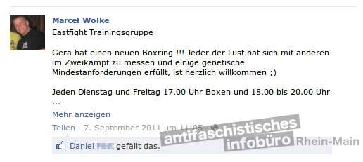Laut dem Facebook-Account der NPD hielt Marcel Wöll [3] eine Schulung zum Thema „Intelligenz“ und „Abstammung“ – dies dürfte eine Umschreibung für Rasseschulung sein. Für Marcel Wöll war es der erste öffentliche Auftritt als Neonazi-Redner seit 2009. Damals, noch in Butzbach (Hessen) lebend, war Wöll wegen Leugnung des Holocaust zu vier Monaten Haft ohne Bewährung verurteilt worden. Nach seinem Gefängnis-Aufenthalt zog Wöll nach Ostthüringen, die letzten Monate trat er wiederholt als MMA-Kämpfer für den Kampfsport-Club ‚Eastfight‘ aus Gera an. Im ‚Eastfight‘ [4, 5] trainieren vor allem Neonazis und ihr soziales Umfeld.